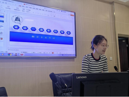 接着,翻译系主任常言老师为同学们介绍了翻译专业的师资、培养方案和实习实践方面的内容。首先,常言老师细致地讲述了翻译专业的培养目标、培养方案和课程安排,为同学们接下来的学习描绘了清晰的蓝图。然后,常言老师还介绍了本专业的实习实践平台,并鼓励同学们积极参与实践,参加竞赛,考取职业证书,以提升自己的竞争力。