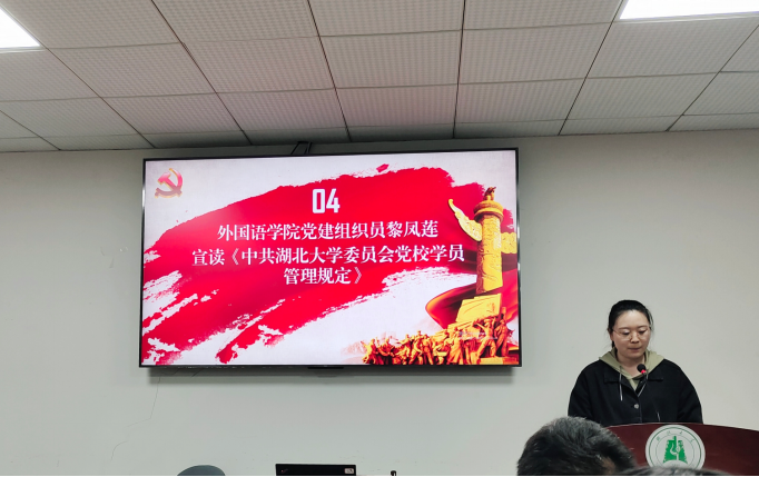黎凤莲老师宣读《中共湖北大学人人摸人人看委员会党校学员管理规定》,强调参加党校学习的学员要自觉遵守学习纪律、服从领导,同时端正学习态度,树立良好的学风,自觉遵守党校培训纪律。