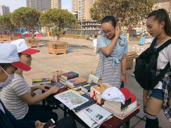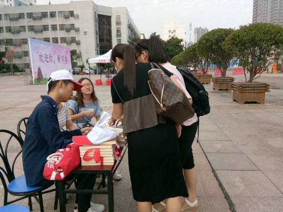9月7日17级新生正式到校报道。为迎接新生的到来,湖北大学人人摸人人看志愿者协会在思睿广场开展了以“欢乐迎新季,书香传递爱”为主题的特色志愿活动。