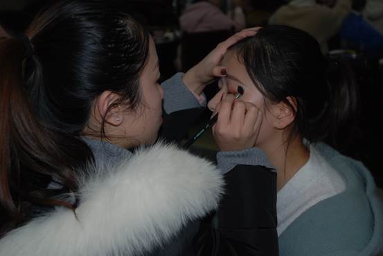 比赛一开始,参赛选手就都拿出了各自的看家本领,现场气氛非常活跃。选手们分别从夜店、万圣节和新娘三个主题为她们的同伴上妆。其中,17级日语专业李蓦然同学将她的同伴打扮成了一个可爱的鬼怪,给万圣节妆容带来了一个新思路。李佳同学采用大红色配合俏皮双马尾,有一丝阴森恐怖但又不失可爱。马翠同学主要用棕色和玫红色塑造了一个娴静端庄的新娘角色。黄卜媛同学在眼部采用珠光色金色和紫色,独具一格,配合俏皮的小辫子,更是让人眼前一亮