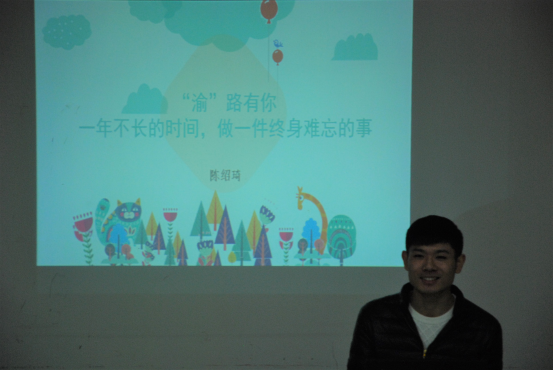 陈绍琦于去年7月随湖北大学研究生支教团队前往重庆市双阳中学支教,在讲座中他分享了该次支教的经历和感悟。首先,他分析了所在支教中学存在的问题。他说,“现在乡村学校的环境都改善了很多,最大的问题在于思想贫困及师资力量的薄弱。所以我们要用心和学生沟通,带领他们看到不一样的世界。”接着介绍了团队的日常工作,包括课堂教学、课外活动和志愿活动。他提到在支教期间团队成功地开展了“模拟法庭”,普法的同时也拓宽了学生的视野,引导他们树立正确的三观。陈绍琦最后分享了自己的心路历程,从急功近利升华到追求实现自我价值,支教不仅锻炼了他的能力,更使他的思想变得成熟。他说,“我们不要只局限于自己,而应该多想想可以为别人做点什么。”