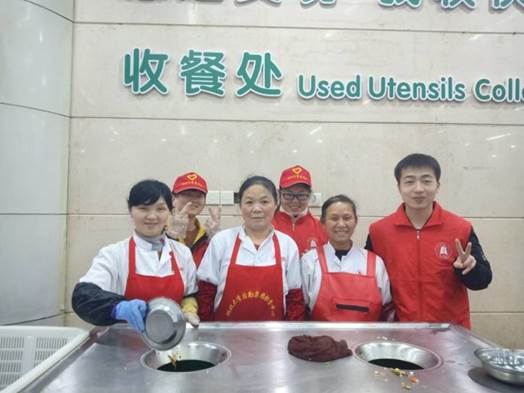 活动当天,志愿者与食堂工作人员高度配合,帮助引导就餐人员将剩余饭菜倒入泔水桶中,并微笑着提醒他们将餐具一一分类,将碗盘勺筷一一放好。之后,志愿者拿着抹布和提桶清理餐桌上剩余的食物残渣,虽然油腻肮脏,他们依然耐心地用抹布将桌子仔细擦拭干净,并且将椅子按要求正确归位。虽然又脏又累,但志愿者的脸上依然挂着笑容,这感染了每一位就餐人员。他们十分配合志愿者的工作,将餐盘按规定放好,并给志愿者投去赞许的目光。食堂工作人员说道:“这些志愿者小娃娃们啊,不怕苦不怕累,什么脏活累活都抢着干,帮了我们很多忙,真的感谢这些志愿者们!”