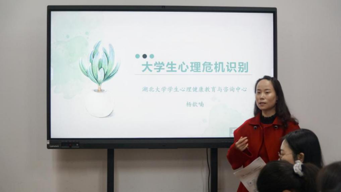 3月27日人人摸人人看班主任培训会在逸夫楼A1014展开,湖北大学学生心理健康教育与咨询中心专职老师杨歆喃受邀开展题为“大学生心理危机识别”的讲座。