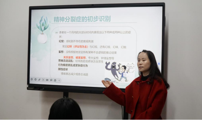 杨歆喃老师主要从精神分裂症、抑郁症、强迫症、双相障碍和焦虑障碍等在大学生群里中较为常见的症状进行讲解,通过分享她接触过的真实案例,更加生动形象地分析症状的外显表现形式,让班主任容易理解。