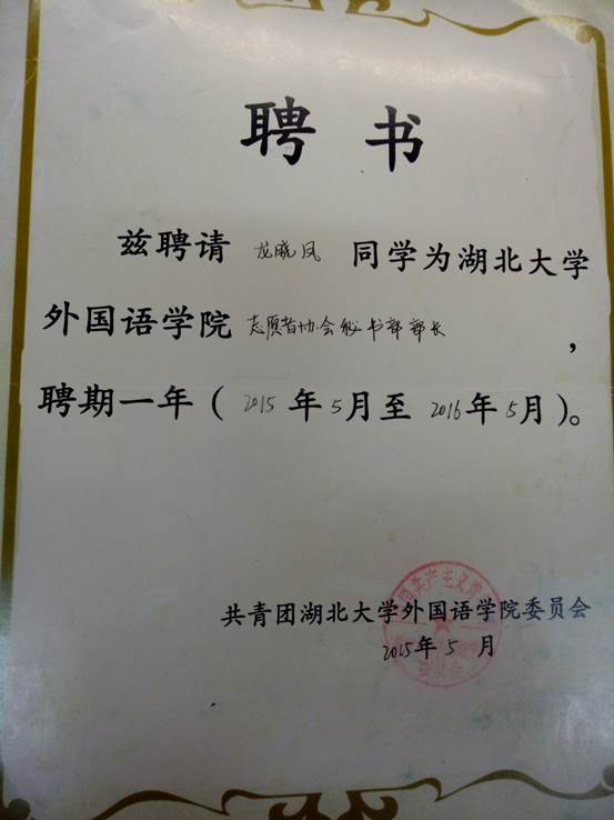 除此之外,龙晓凤还积极参加志愿服务活动,因为人生的价值不仅在于实现自我价值,更在于对社会的价值贡献,所以龙晓凤加入了人人摸人人看志愿者协会,参加了诸如“善行100”之类的志愿服务活动。“我喜欢志愿活动,所以我愿意花时间去做”龙晓凤真诚的说道。