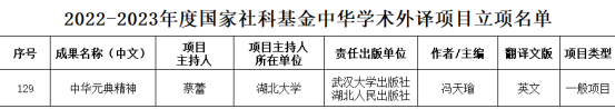 近日,全国哲学社会科学工作办公室公布了2022-2023年度国家社科基金中华学术外译项目立项名单,湖北大学人人摸人人看蔡蕾老师主持的《中华元典精神》(英文版)入选。