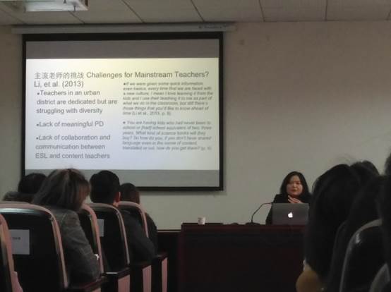 讲座开始,作为湖北大学的杰出校友和海内外知名学者,李教授介绍了她的求学和工作经历,以她自己的亲身体会告诉我们,在文化差异和全球化的背景下,语言教师应该积极地进行自我反思,不断地寻找自己的努力方向。首先,李教授从中国人学习外语的角度出发,介绍了中国的外语教学存在的问题:过于注重阅读和听力,较少进行口语练习;缺乏和老师、同伴互动的机会。紧接着,李教授重点从外国人学习中文的角度,剖析了海外汉语教师在教学时会遇到的困境,例如:没有统一的教学资料、教学方式和当地学生不符、课堂管理方式和当地学生不符、不会用汉语进行学科内容教学、不知何时在课堂使用汉语、和当地教师与家长沟通和合作的问题。李教授还用她女儿在海外学习汉语的例子告诉我们,当前国际汉语教师在全球化背景下迫切需要改变教学方式,使汉语教学与国际接轨,提高学习者的积极性。从以教师为中心的方式转向教师中心的方式,改变课堂组织的方式,增加课堂内容的趣味性。最后,李教授重点向我们展示了,全球化背景下教师需要努力的方向:1)角色转变:作动态的课程设计师,在教学中不断反思,拒绝照本宣科。2)需要的能力和素养——语言素养、教学素养、职业反思素养和时政素养。在方法论上,不断改进教师培训的内容和方式:1)现行的——Infusion/Piecemeal Model; Add-on Model。2)新思维Some Other Possibilities:根据学生们的职业规划,为他们量定制培养方案。