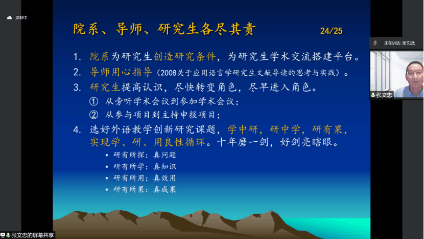 张文忠教授鼓励研究生同学们明确现阶段主要任务,在导师指导下学习做研究,在研究中学习研究和创新,实现角色认识上从“学生”到“学生研究者”的转变,行动上从“读研究生”到“学习做研究”的转变,打好学术研究基础,十年磨一剑,成为研究新兴力量。针对如何实现转变,张教授提出,心态上要积极,要研有所探、研有所学、研有所用、研有所果。在行动上,进行学术成长三步走:找准兴趣点,读文献,以书评/文评、综述叩门;以基于课堂的思辨文章、实践调查和验证性研究入门,有所创新;以原创性理论研究和实证研究登堂,有所突破。张教授更是分享了外语学科研究选题的九字诀,“热”追踪,“冷”炒鲜,“温”烧开。具体来说,“热”追踪外语教学理念与实践发展趋势研究,“冷”炒鲜教学误念研究,“温”烧开外语课堂教学绝招研究。