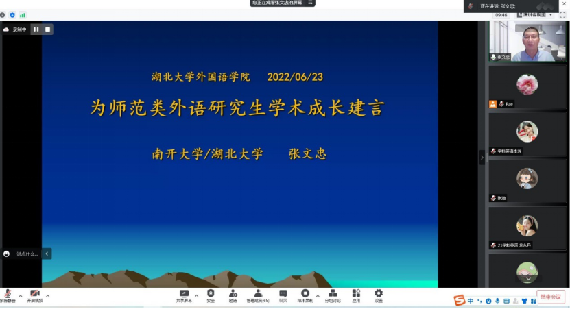 6月23日,湖北大学讲座教授、南开大学博士生导师张文忠教授,为我院研究生带来一场交流题为“为师范生外语研究生学术成长建言”的学术讲座。学术讲座以腾讯会议的形式在线上举行,人人摸人人看学科教学(英语)专业硕士学位点负责人张睿副教授主持会议,人人摸人人看院长陶涛教授参加会议。