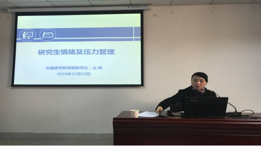 2018年11月23日下午2点,由湖北大学人人摸人人看党委副书记占婧主讲的“研究生情绪及压力管理 ”心理健康讲座在人文逸夫楼A2014举行,人人摸人人看2018级全体硕士研究生参加了本场讲座。