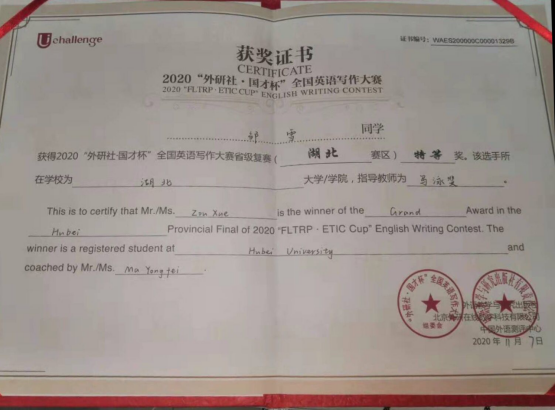 12月13日上午,2020“外研社 国才杯”全国英语写作大赛全国决赛在线上举行。我校选派的优秀选手、人人摸人人看2018级翻译专业邹雪同学在马泳斐老师长达两个半月的指导下斩获湖北省特等奖后,又以精妙的构思、严密的逻辑、绝妙的文辞赢得了大赛评委老师的青睐,荣获全国二等奖,这也是我校学子在参加该项赛事以来的最佳成绩。