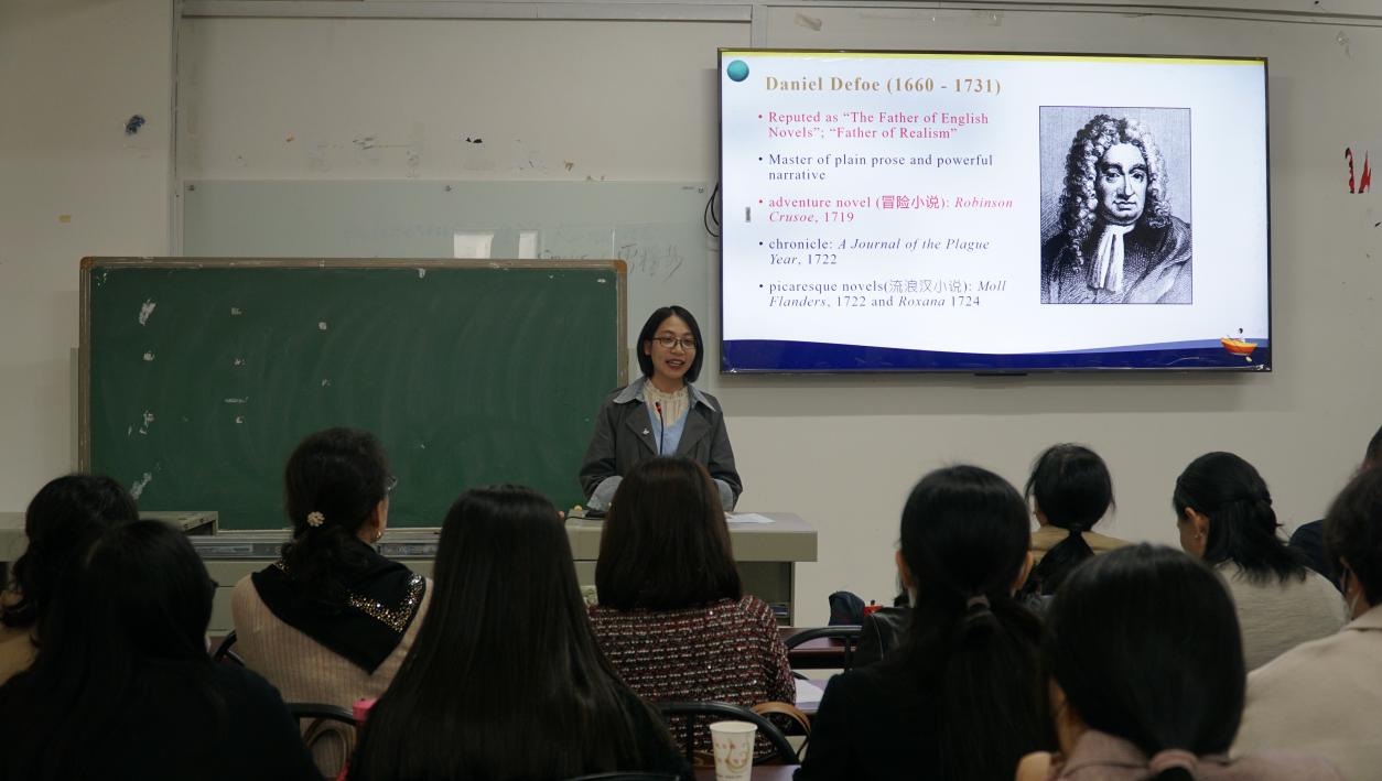 英语系周义媛老师以“18th century literature”为教学内容,讲解“Daniel Defoe and His Robinson Crusoe”,在文学知识讲解的过程中也注重提高学生的文学鉴赏能力和思辨能力。