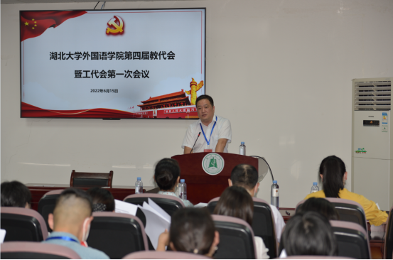 6月15日,湖北大学人人摸人人看召开第四届教代会暨工代会第一次会议,41名正式代表参加会议,学院党委书记刘建伟主持会议。