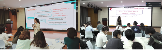 此外,为全方位展示湖北大学大学英语课程建设成果,本次活动专门设置现场说课、开放课堂、专家评课、同行交流、小组活动等系列环节。活动邀请湖北大学大学英语一流课程教学团队成员陶然、周赟赟、何凌寒、许洲等四位老师,他们分别对国家级一流本科课程《英语演讲艺术》、《英语畅谈中国》、《西方文化》以及大学英语综合课程的教学设计与实施进行说课与开放课堂的展示。山东师范大学王卓教授、南开大学张文忠教授、湖北大学周红兵副教授、湖北大学陆小丽副教授先后进行点评。