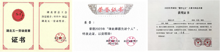 近五年,多名青年教师在国家级、省级的外语教师教学竞赛中获奖,如第七、八届湖北省高校青年教师教学竞赛外语组一等奖、“外教社杯”全国外语教学大赛全国总决赛特等奖及一等奖、“外研社杯”教学之星教学大赛全国总决赛一等奖等。